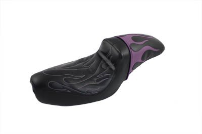 #Purple flame hustler gunfighter seat features sewn inlay of colored flames on rear pad area with matching flame stitch and thread in front driver area. Molded high density foam provides comfortable riding and driver back support.