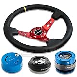 NRG-SRK-110H+200NB+101NB+006RDY, NRG Innovations 13.78" 350mm 3" Deep Dish Style Black Leather Yellow Center Marking Red Spokes Racing Steering Wheel Combo with 6 Hole Short Hub Adapter with Gen 2.0 New Blue Quick Release with New Blue Lock Hub Kit SRK-110H